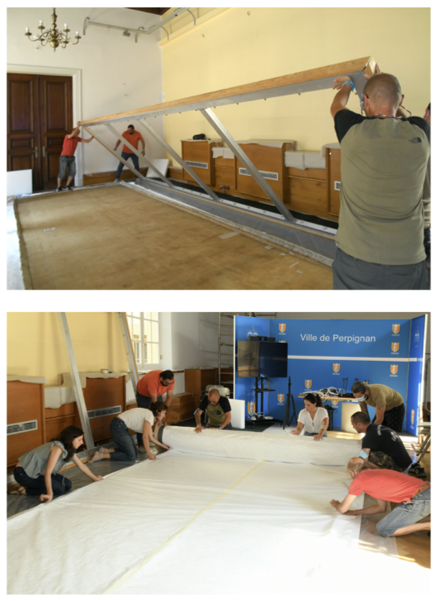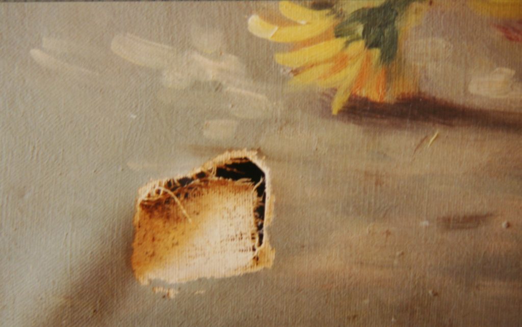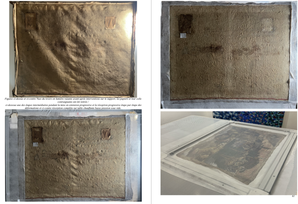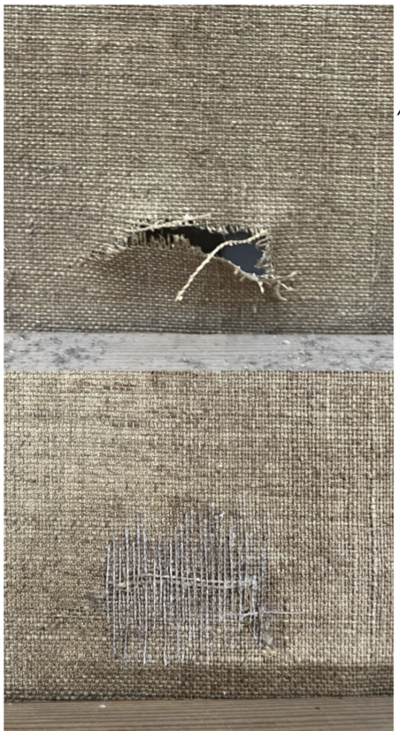 - Tout type d’altération touchant le support, quelles que soit sa gravité, peut être traité en atelier: déformations, déchirures, trous, fragilisation de la tension, infestations par les micro-organismes ou insectes xylophages … Interventions ponctuelles de conservation préventives et curatives: pose de protections facing et cartonnage pour sécuriser les interventions, nettoyage superficiel du support, retrait d’anciennes pièces et d’anciens adhésifs de restauration, reprise de déchirures en fil à fil et suture, pièces de renfort ou d’incrustations, rétablissement de déformations, refixages ponctuels de la couche picturale pour rétablir les soulèvements, pose de bords de tension définitifs….